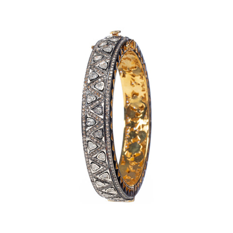 Rose cut diamonds are set in a pattern of silver and pave diamonds.