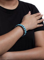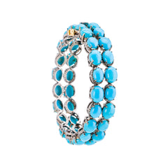 Bright and stackable, pairs of cabochon turquoise stones are set with diamonds.