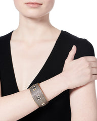 Rose cut diamond clusters are set on a broad, pave diamond bracelet.