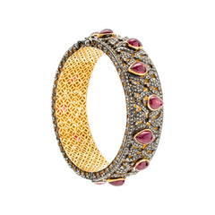 Tear drop shaped rubies are surrounded by an intricate diamond tracery.