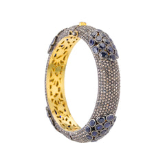 Clusters of faceted sapphires are set on a sparkling diamond backdrop.
