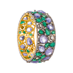 Faceted emeralds and tanzanite stones are set with pave and rose cut diamonds.