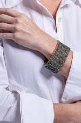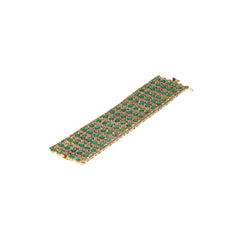 Rows of emeralds and diamonds are set on an articulated silver ribbon. Unique and stunning.