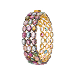 Faceted tourmaline stones of every color are set in three even rows of diamond settings.