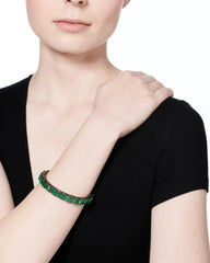 Pave diamonds accent a uniform row of luxurious cushion cut emeralds.