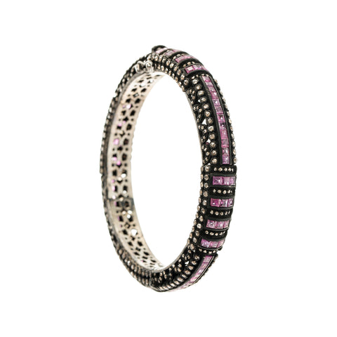 A geometric pattern of diamonds and emerald cut rubies set in rows.