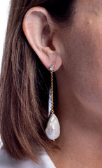 Baroque pearls hang from diamond studs on 18kt gold chains.