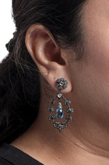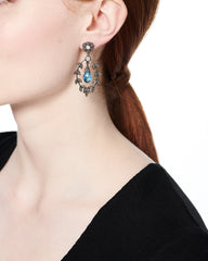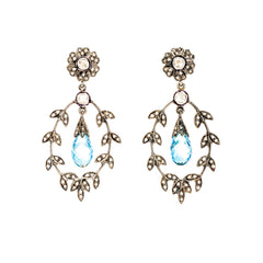 Delicate diamond wreaths surround faceted blue topaz drops.