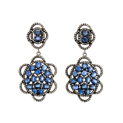 A traditional floral design is modernized with clusters of blue sapphires ringed with diamonds.