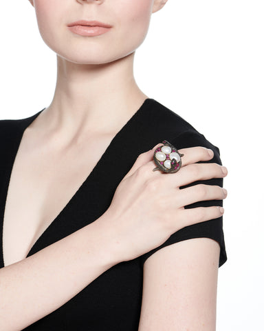 Ruby-eyed spinel snakes wrap around a clutch of pearl eggs and rubies.
