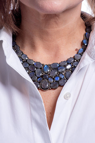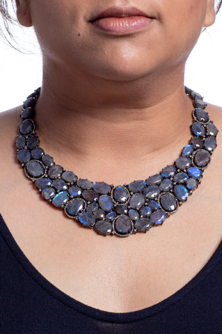 Faceted labradorite stones are set like cobblestones with diamond accents.