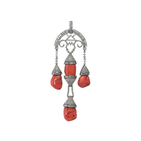 Diamond-capped coral stones hang from a regal, arching diamond chandelier.
