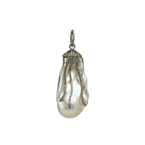 Diamond-studded silver tendrils grip a large baroque pearl.