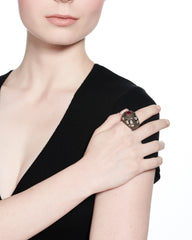 Large rose cut and pave diamonds adorn this ruby cocktail ring.