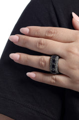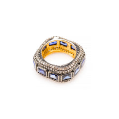 Square cut sapphires wrap around soft square ring with diamond accents.