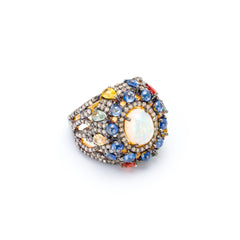 Cabochon tanzanites and faceted tourmalines surround a smooth, central opal.