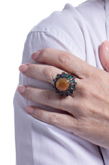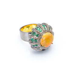 An autumn-hued opal sits atop an emerald and diamond cushion.
