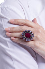 A large faceted ruby is surrounded by cabochon tanzanites and pave diamonds.
