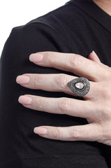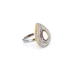 Rows of pave diamonds surround a rose cut diamond teardrop.