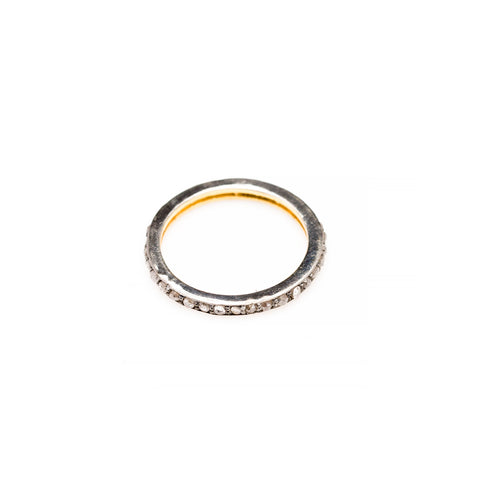 Tiny, rough diamonds are set in a thin band. Perfect for wearing with other rings or alone.