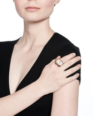 A gold vermeil lined, diamond studded silver ring clutches a baroque pearl.