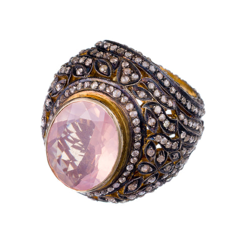 Sparkling diamonds and exquisite 21kt gold metalwork frame a beautiful, faceted rose quartz stone.