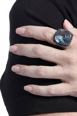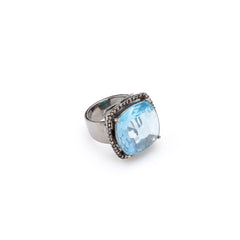 A diamond and silver setting holds a large, beautifully faceted topaz.