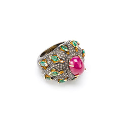 Faceted emeralds and a cabochon ruby are beautifully set in a cocktail ring dome.