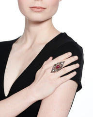 A cabochon ruby is the centerpiece of an intricate diamond design.