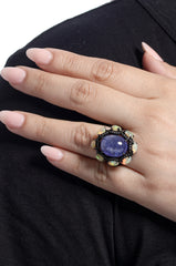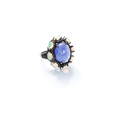 A starry cabochon tanzanite is surrounded by opals and diamonds.