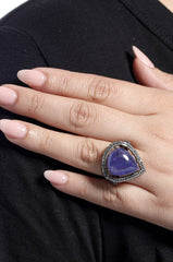 A teardrop tanzanite stone is set suspended within a diamond frame.
