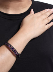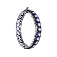 Large amethysts are surrounded by diamonds and set in silver. Perfect for stacking with multiple bracelets.