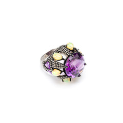 Opals, amethysts and diamonds surround a central faceted amethyst.