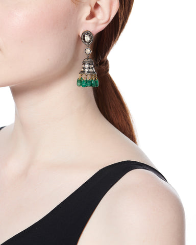 Smooth emerald drops hang from traditional diamond bells.