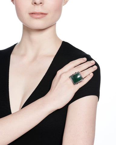 A faceted emerald sheet is bordered by rows of pave diamonds.