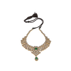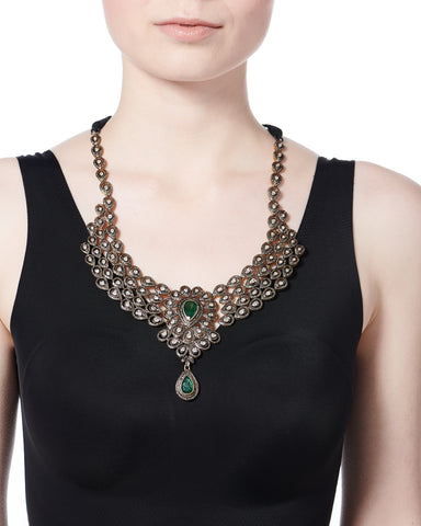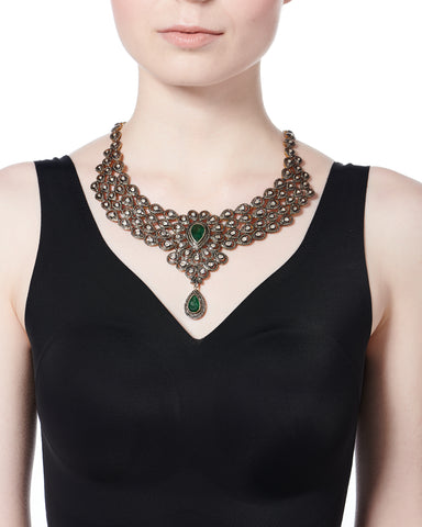 Individually set and ornamented rose cut diamonds flank two brilliant faceted emeralds. Hung from an adjustable silk cord tassel.