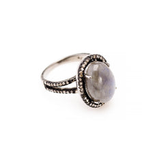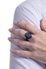 Pave diamonds pop against blackened silver while a cabochon labradorite sits prong-set among them.