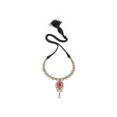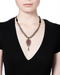 Pave and rose cut diamonds accent a slender faceted ruby on an adjustable silk cord.