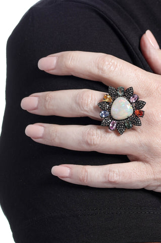 A central opal is surrounded by multicolored sapphires and diamonds.