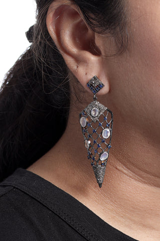 Textured, silver lattices are ornamented with tiny sapphires and faceted moonstones.