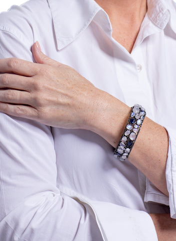 Cabochon moonstones of all shapes and sizes are accented with faceted sapphires and tiny diamonds.