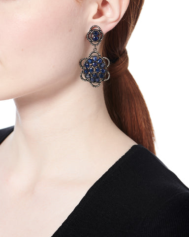 A traditional floral design is modernized with clusters of blue sapphires ringed with diamonds.