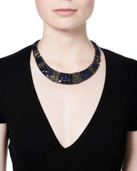 This handcrafted collar is composed of an intricate design of blue sapphires set with diamond accents on an adjustable cord.