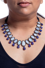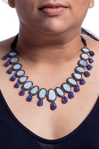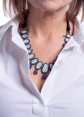 Pairs of Australian opals and cabochon tanzanites are linked together and strung on an adjustable silk cord.